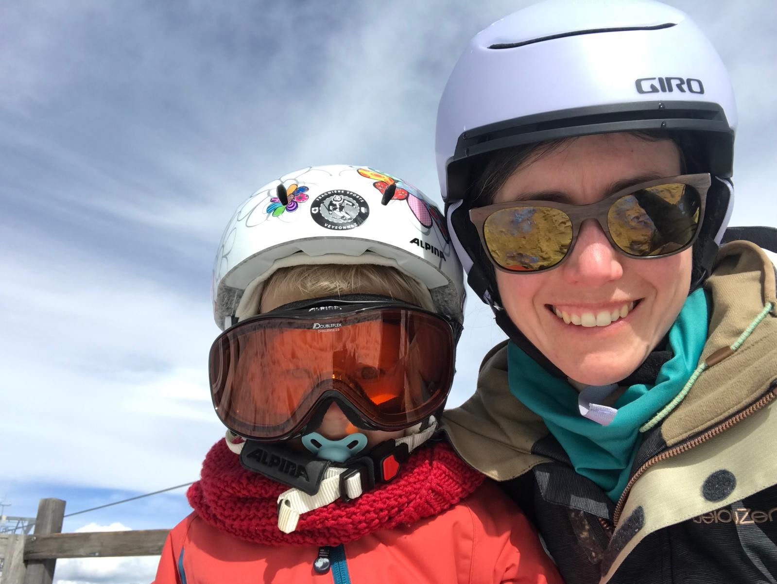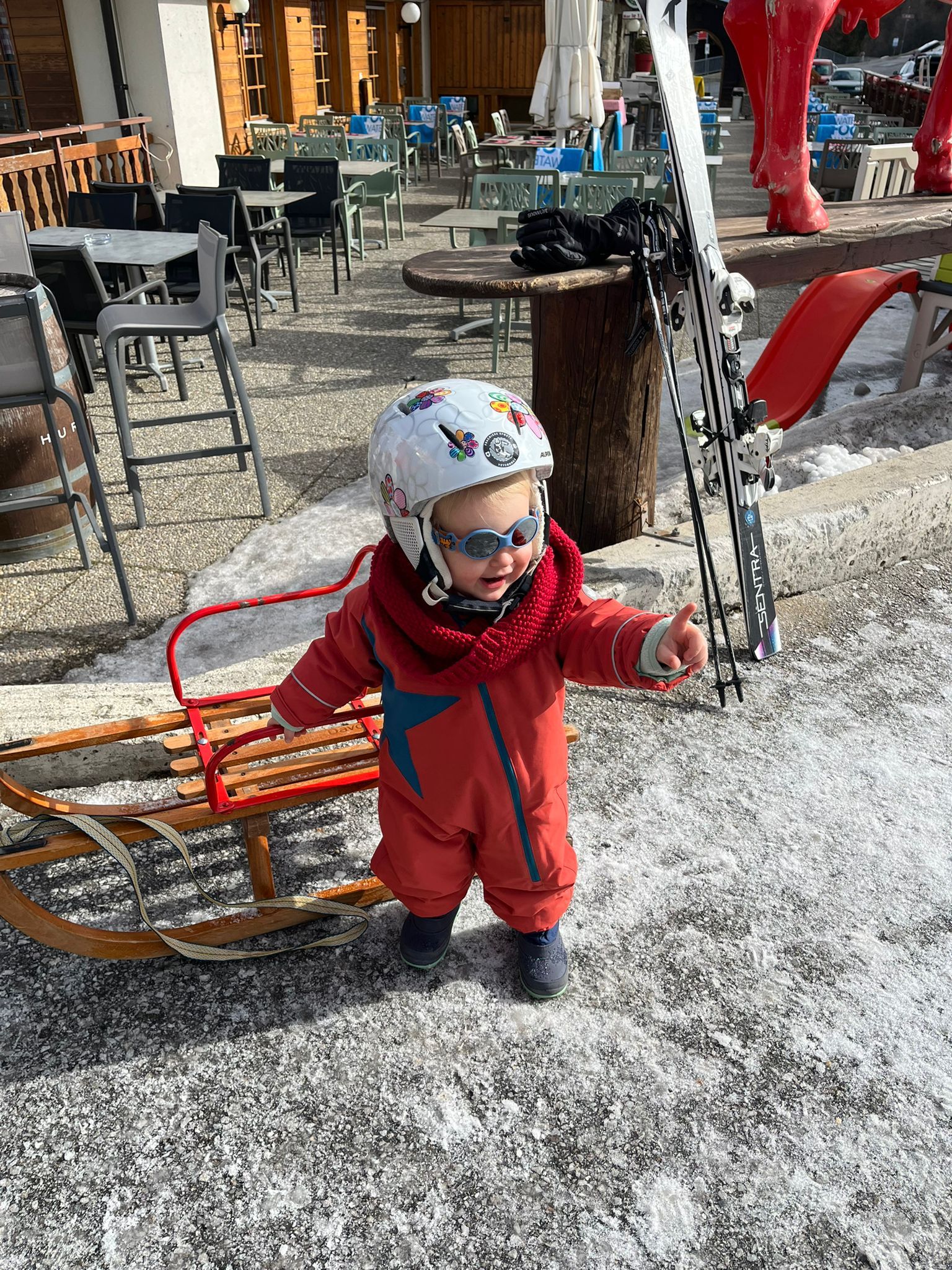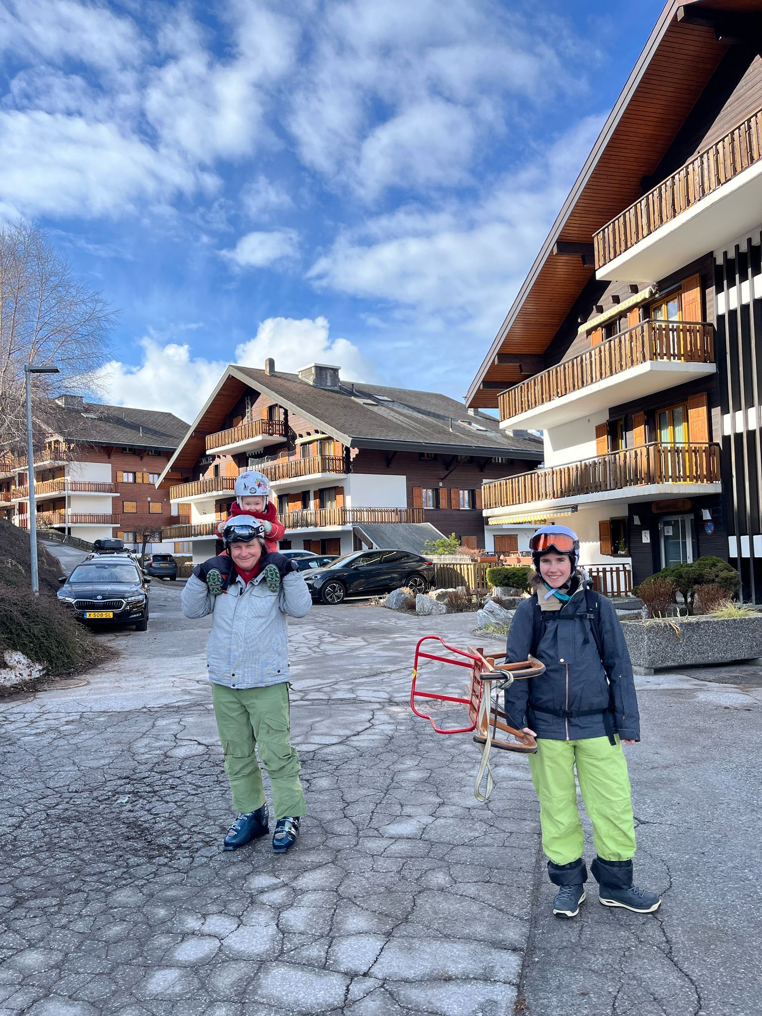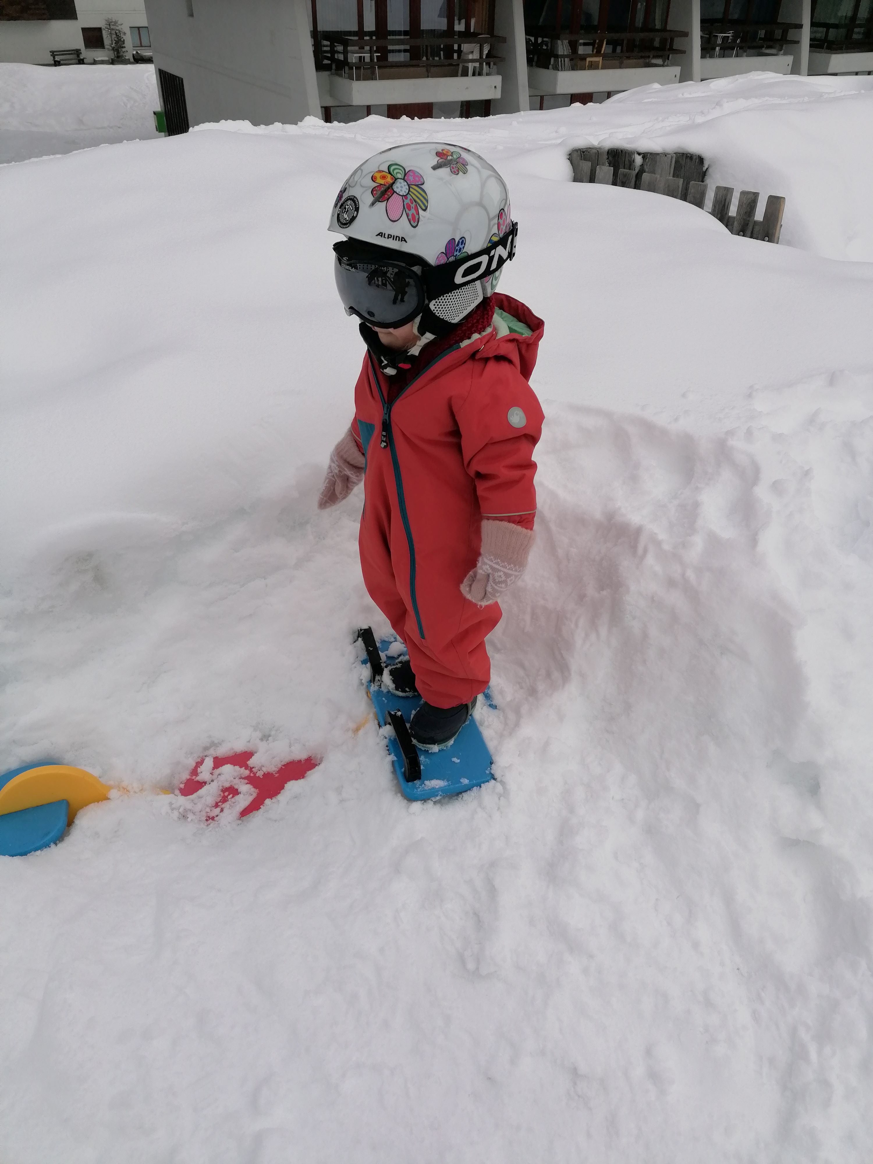 Gwen und ihre Mama auf dem Schnee mit Schlitten, Ski und vermeintlichem Snowboard.