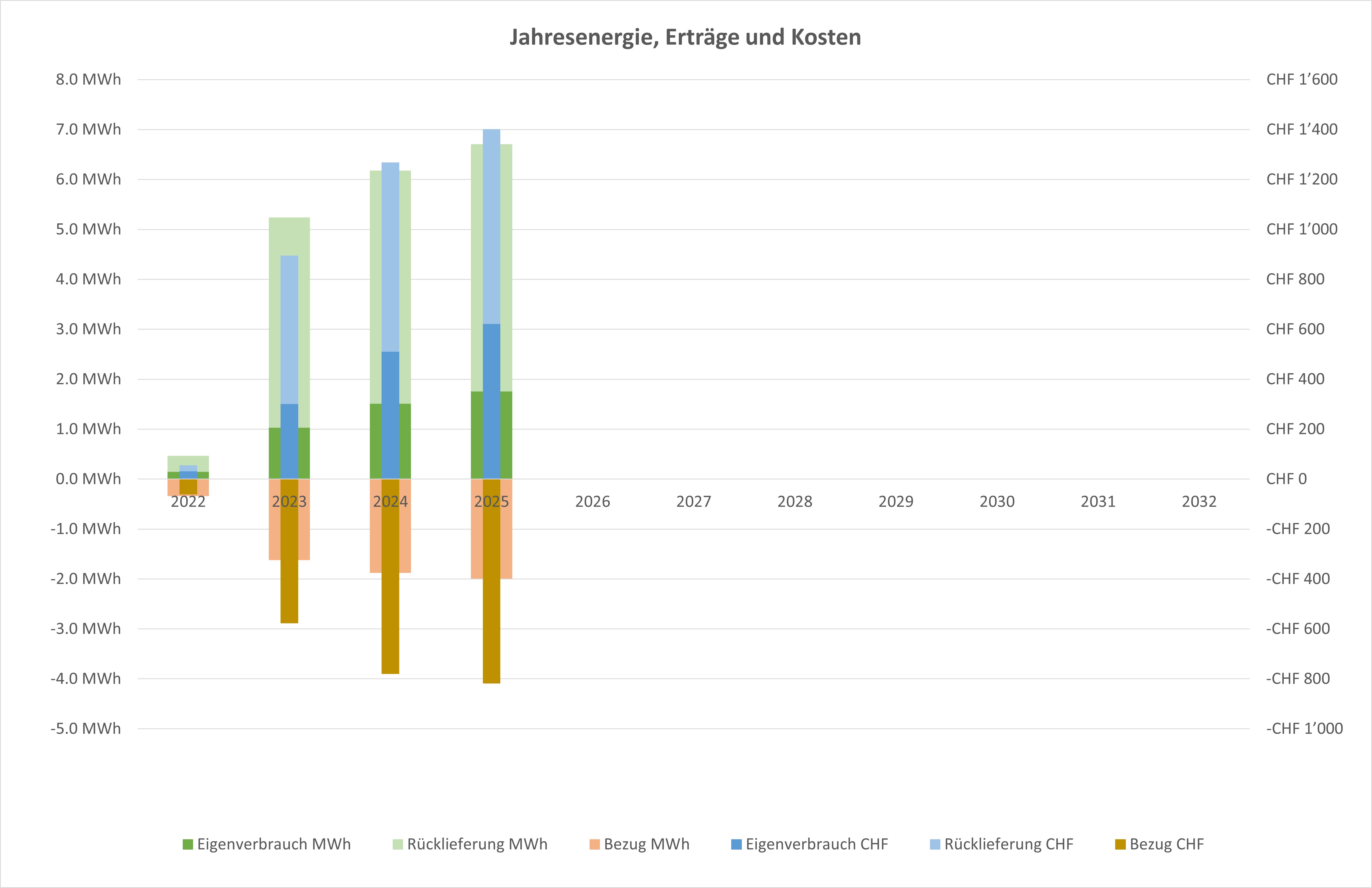 Nun bin ich gespannt, wieviel elektrische Energie wir im Jahr produzieren. Werden wir die von mir prognostizierten 6'300 kWh pro Jahr erreichen? Wie lange wird es dauern, bis wir