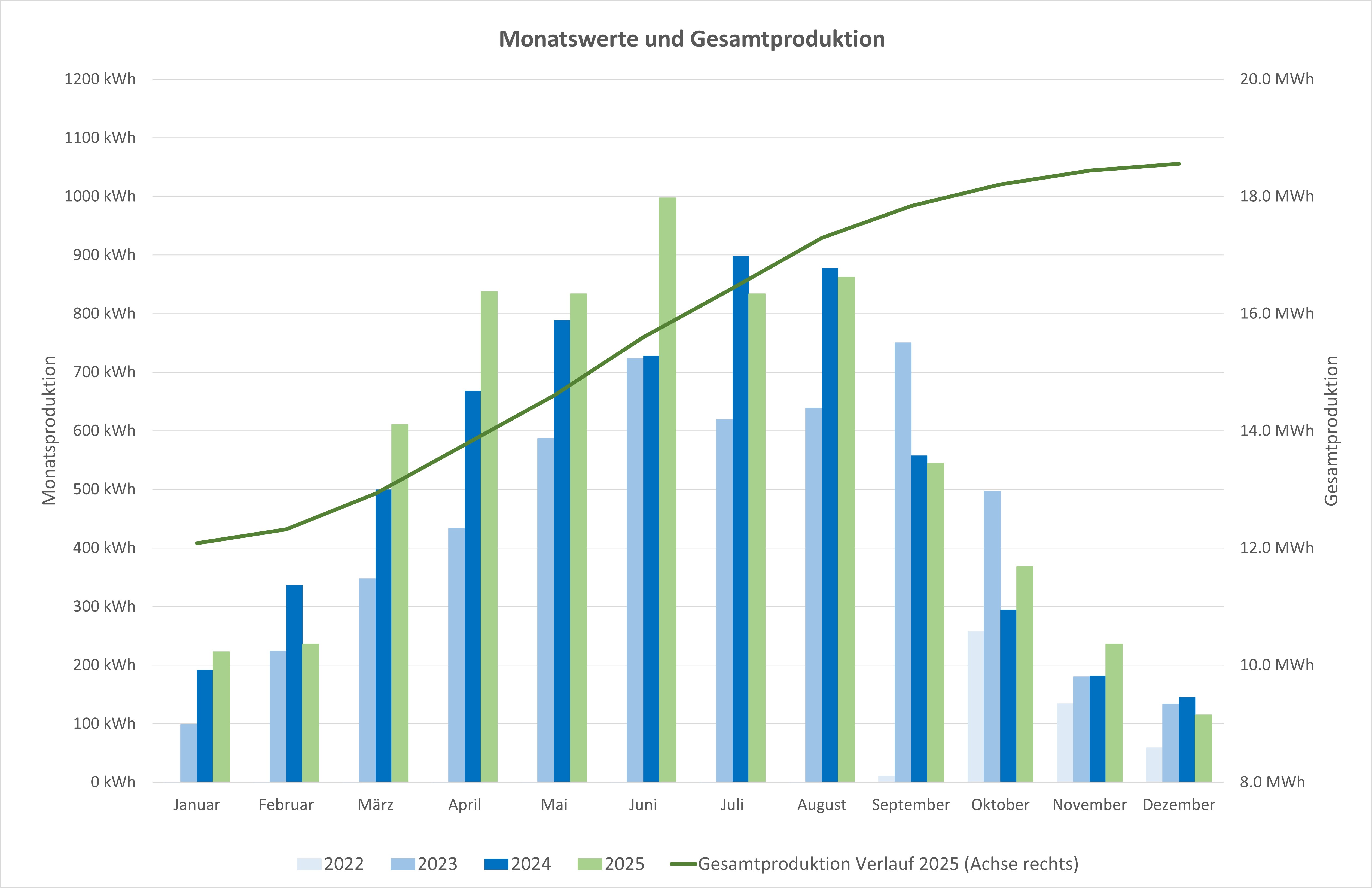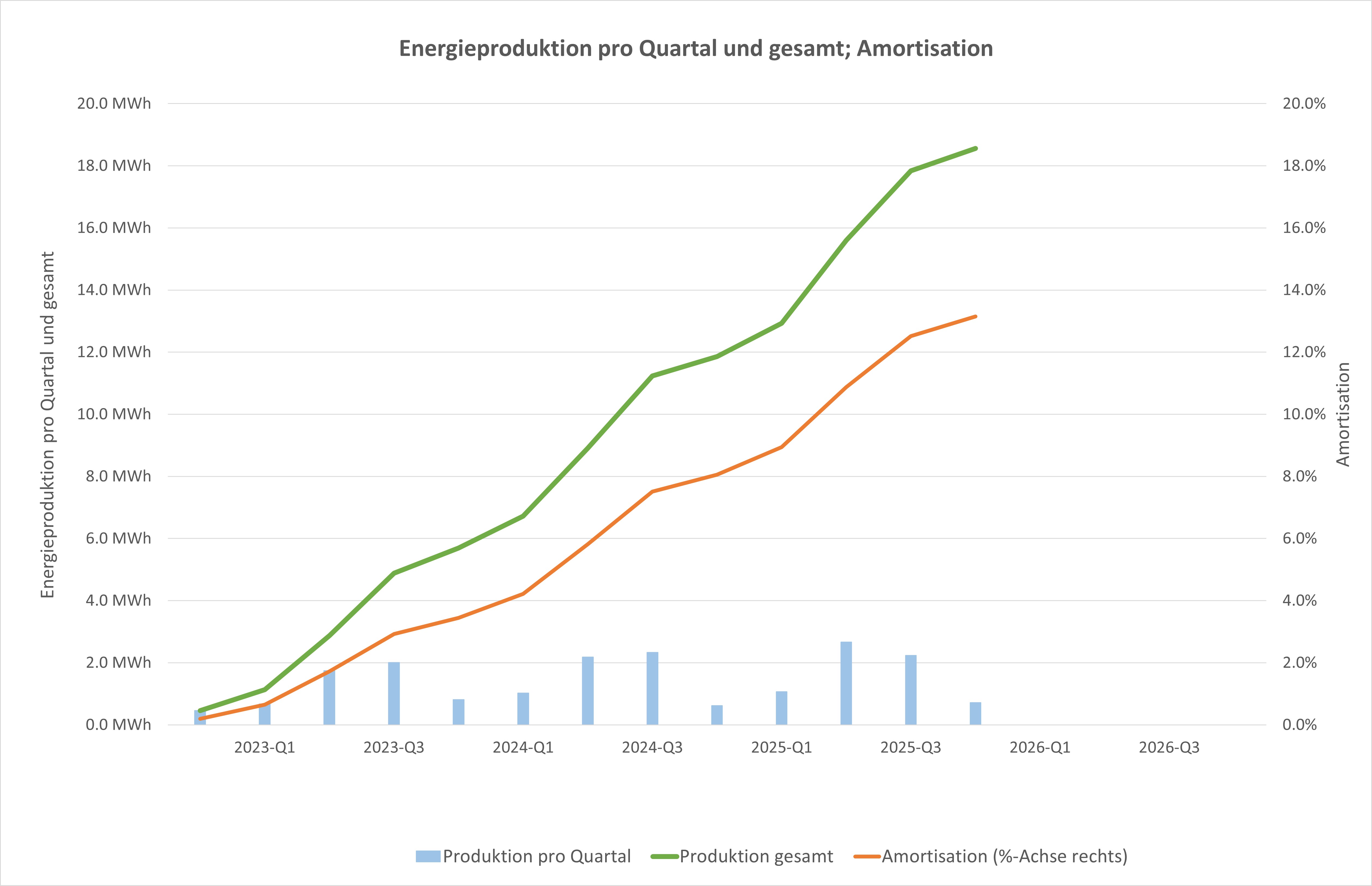 Per 31. Dezember 2025, also nach 3.25 Betriebsjahren der PVA wurden 18.6 MWh elektrische Energie produziert und ca. 13.1% der Investition konnte amortisiert werden.